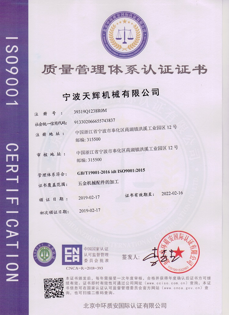 天輝通過了ISO9001:2015 質量管理體系認證。公司內的進料流程、生產流程、生產工藝、出貨流程等精密鑄造加工都是按照ISO9001質量標準執行,嚴格的控制產品質量。在滿足質量的前提下,達到快速交貨,讓客戶滿意。